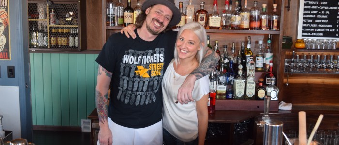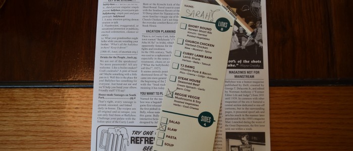 After we passed around the first drink and sampled it to everyone’s liking, we moved onto the food. While the menu is much simpler than Winfield’s Pub (last month’s featured bar) it is still delicious. Ballyhoo has only one option for a main course, house-made sausage, but damn they do it well, and incorporate many different flavor profiles into their six offerings (a photo of the menu is in the top slider). My favorites are the Short Round and the TJ Dawg, my only complaint would be that the rolls are a little big, but it is required to hold all the sausage and toppings they put on. In addition to the meat sausages, Ballyhoo recently added the Reggie Veggie, a vegetarian option that becomes vegan if you order it without the goat cheese. Sarah, our mixologist and self-proclaimed pescetarian, can now enjoy a sausage with the rest of you meat haters. In addition to the sausages, Ballyhoo offers four choices of sides-soup, pasta, slaw or salad. The kitchen staff creates sides in-house daily and they are often as unique as the sausage. I have yet to order dessert, but I hear it is on par with the rest of the food.